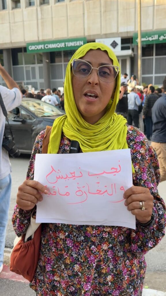 هندة شناوي الناشطة في المجتمع المدني كانت حاضرة في الوقفة الاحتجاجية امام مقر المجمع الكيميائي بمنطقة لافيات بالعاصمة و و في حوارها مع كوسموس ميديا قالت: ” أن المجمع الكيميائي صدر فيه قرار غلق منذ سنة 2017 لكنه يعمل الى اليوم و يخنق أهالي قابس بغازاته السامة …اليوم هناك 9 حالات اختناق خطيرة في صف التلاميذ  و نحن نندد بتخاذل الحكومات المتعاقبة في تطبيق قرار الغلق و نطالب بتفكيك وحدات هذا المجمع الذي خلّف الدمار في قابس”.