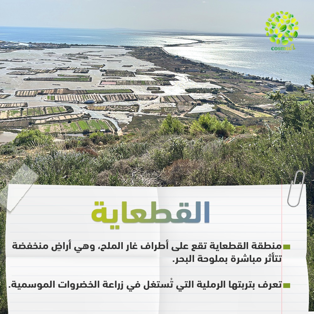 تمثّل حقول القطعاية داخل سبخة سيدي علي المكّي،   27 بالمئة من مجموع الأراضي الزراعية الرملية الممتدة على 220 هكتار. وتتميز بصغر حجمها و محاصيلها الموسمية الأساسية التي تتضمن البطاطا ، البصل، الفلفل، واللوبيا، إضافة إلى مزروعات صيفية مثل البطيخ. يقول علي القارصي “ إن القطعاية تنتج محاصيل بجودة عالية جزء منها معد للتصدير والجزء الآخر يلبي احتياجات العائلة ويمثل مصدر رزقها و جزء ثالث من نصيب السوق المحلية.”   وتتم زراعة هذه المحاصيل  دون ري على تربة رملية تسمح للنباتات بتلبية احتياجاتها المائية عن طريق ملامسة جذورها لطبقة رقيقة من المياه العذبة فوق المياه المالحة
